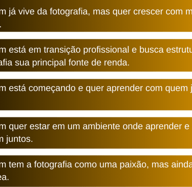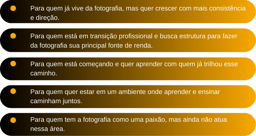 Um encontro por semana com mentores preparados para impulsionar seus resultados na arte e no negócio da fotografia.